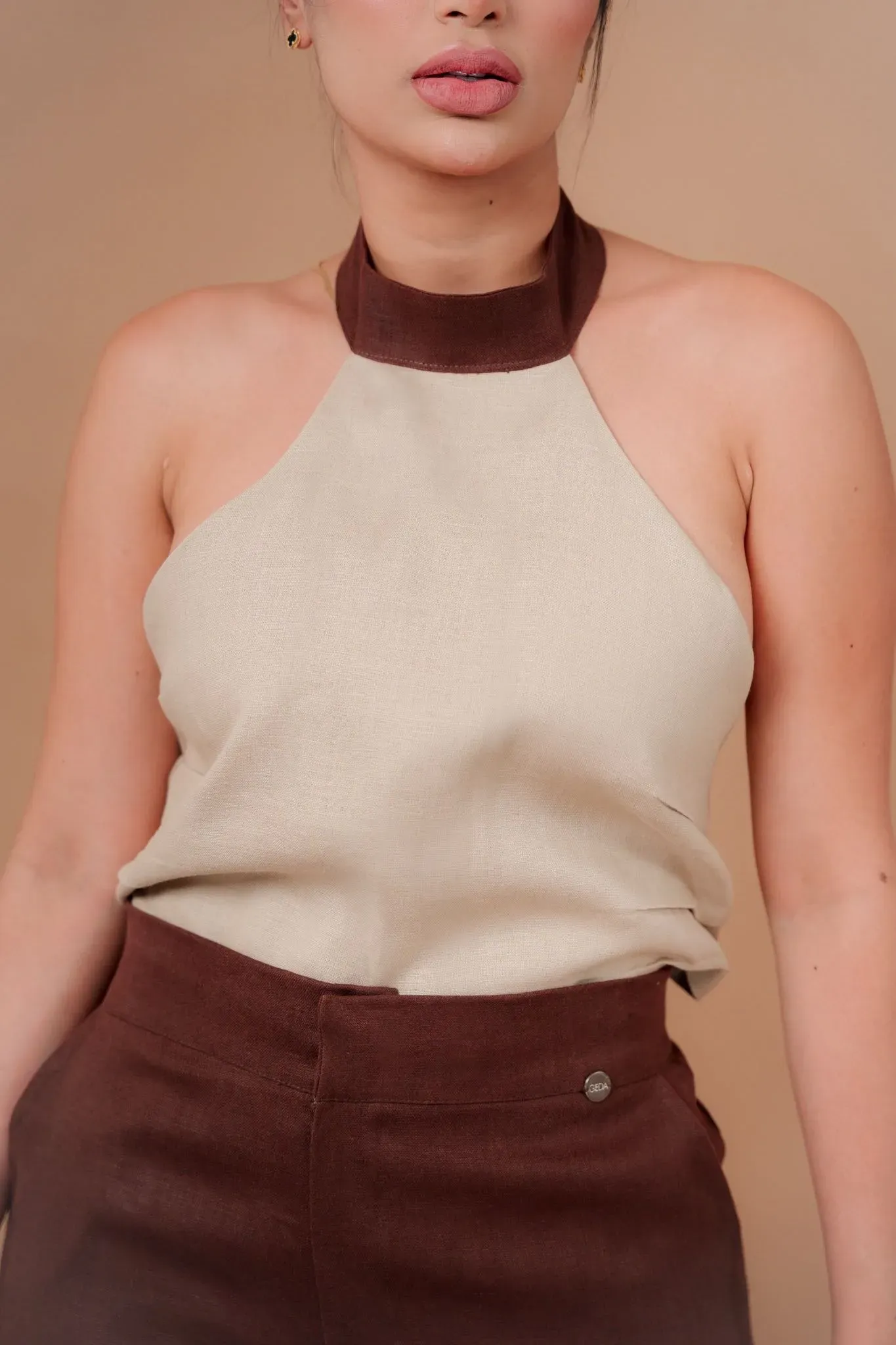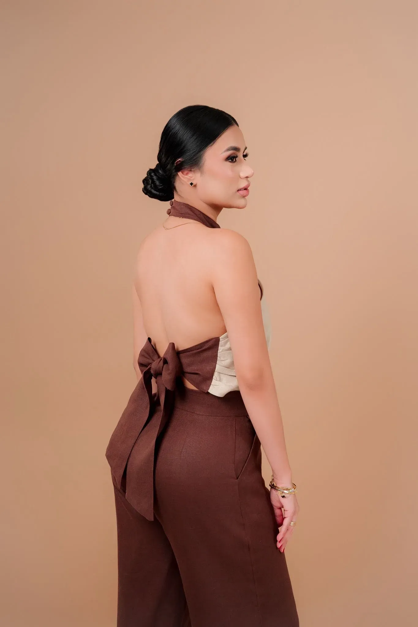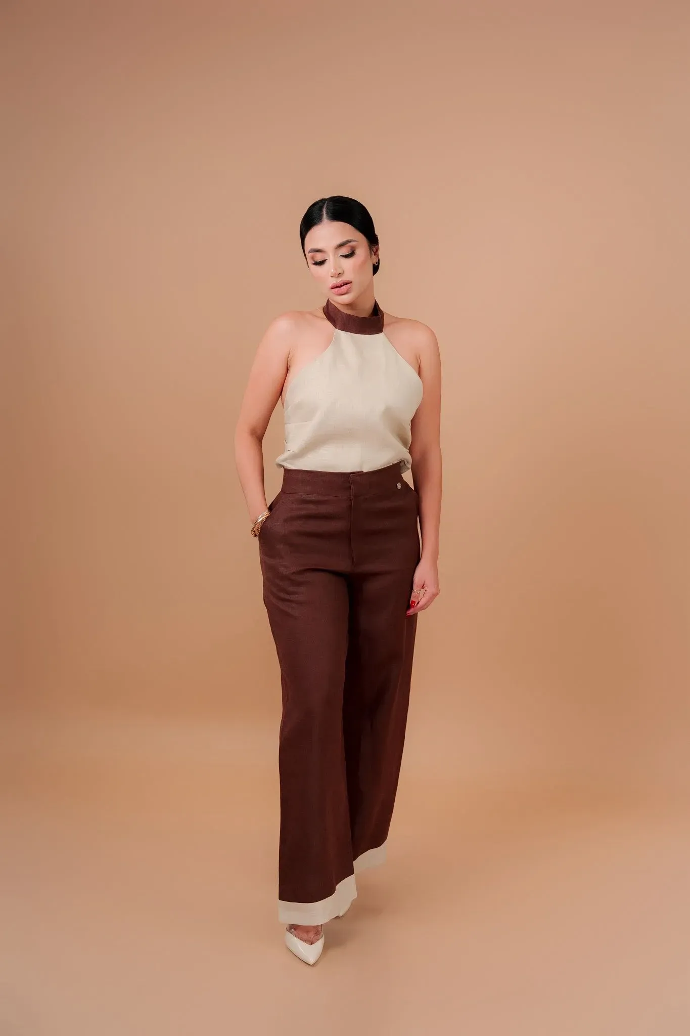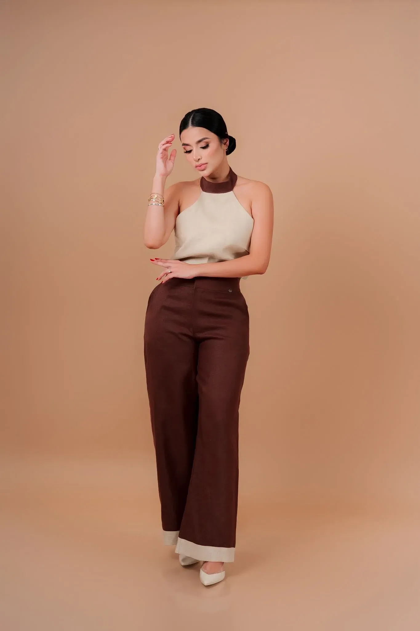 Conjunto a dos tonos en tendencia café - beige que incluye una blusa elegante sin mangas, detallado escote en espalda de tiras gruesas para Anudar tipo lazo, un pantalón café con pretina clásica bota recta detalles de pinzas en la parte delantera con diseño de ruedo inferior en color beige.