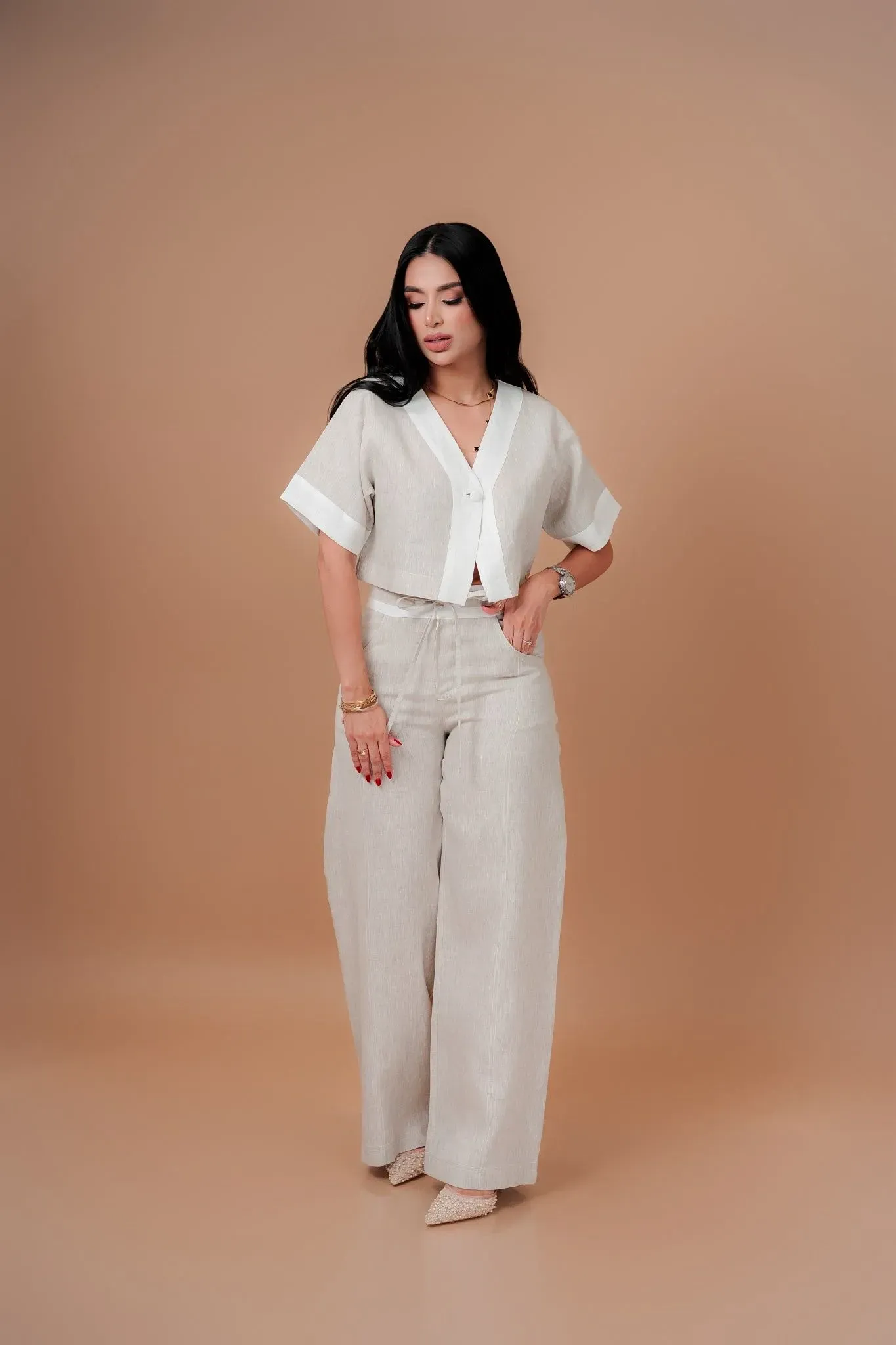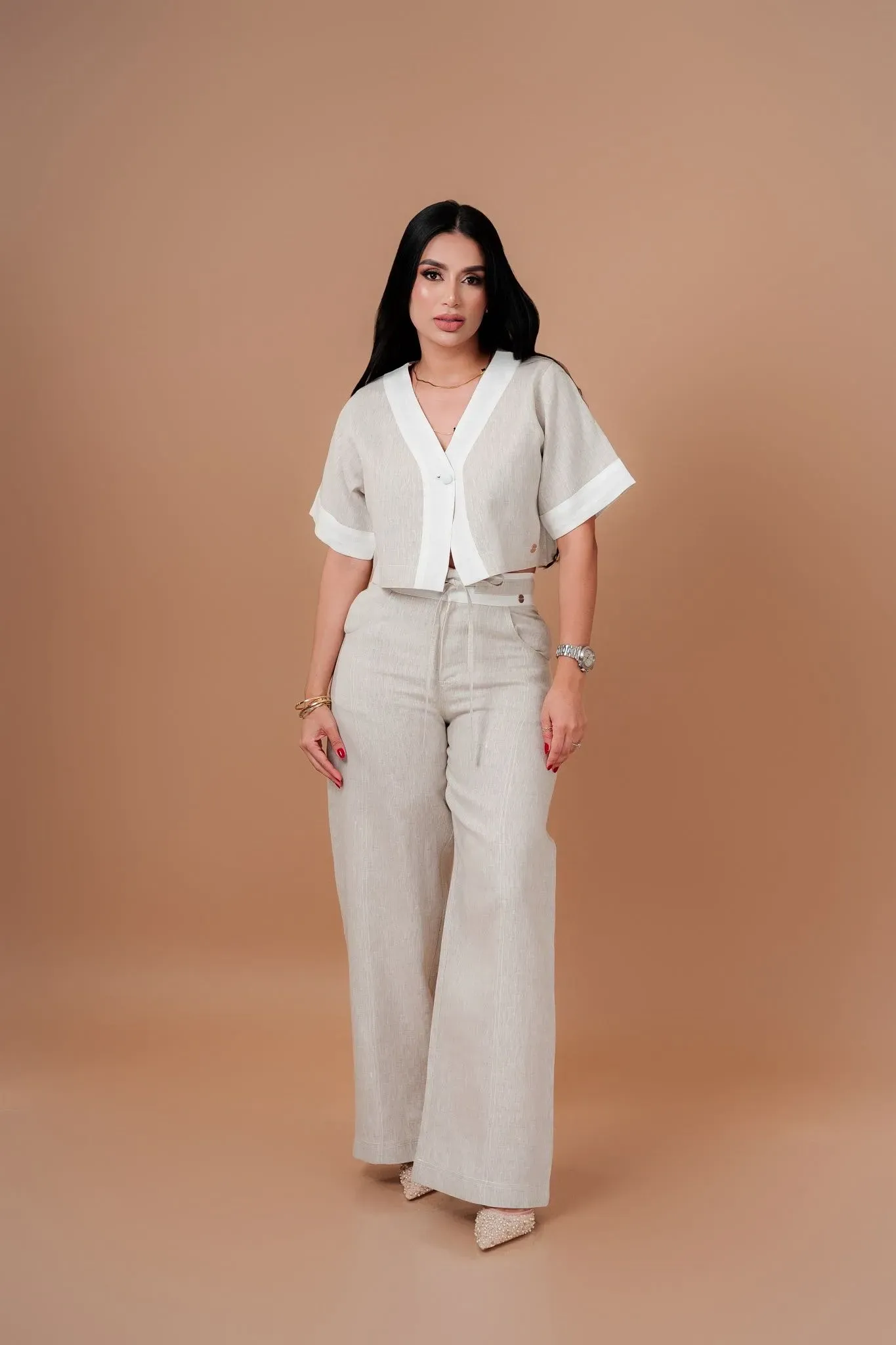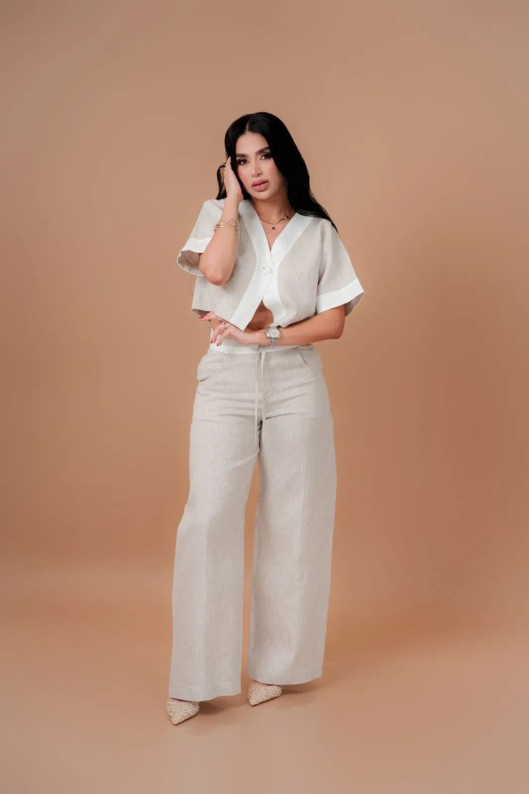 Conjunto elaborado tonos en tendencia avena - blanco que incluye una blusa elegante con mangas, sutil escote en V detalle de botón forrado, en la parte inferior pantalón con pretina clásica túnel interno más tirantes de lujo, corte bota recta semi amplia marcados detalles de pespuntados en los costa...