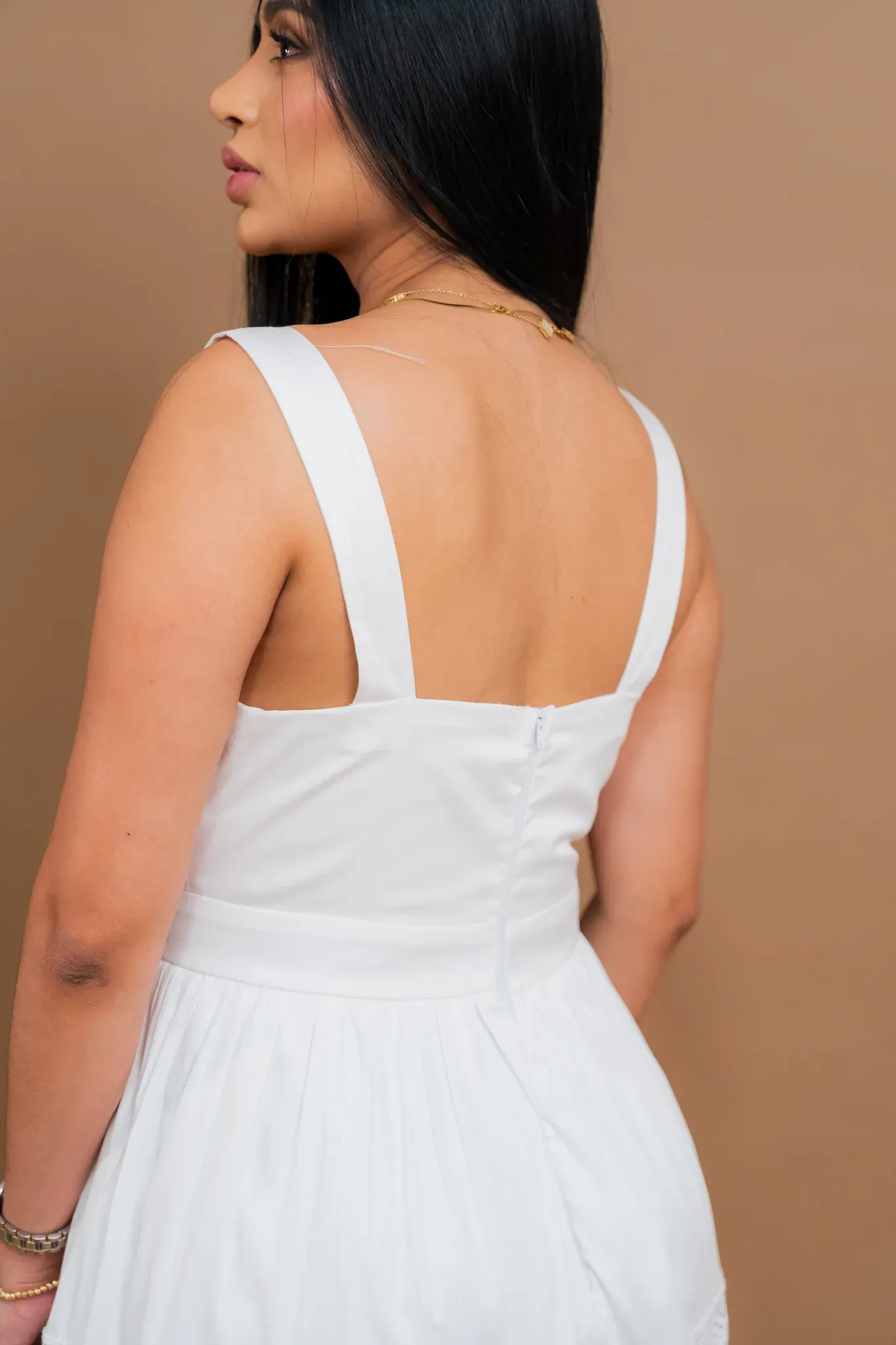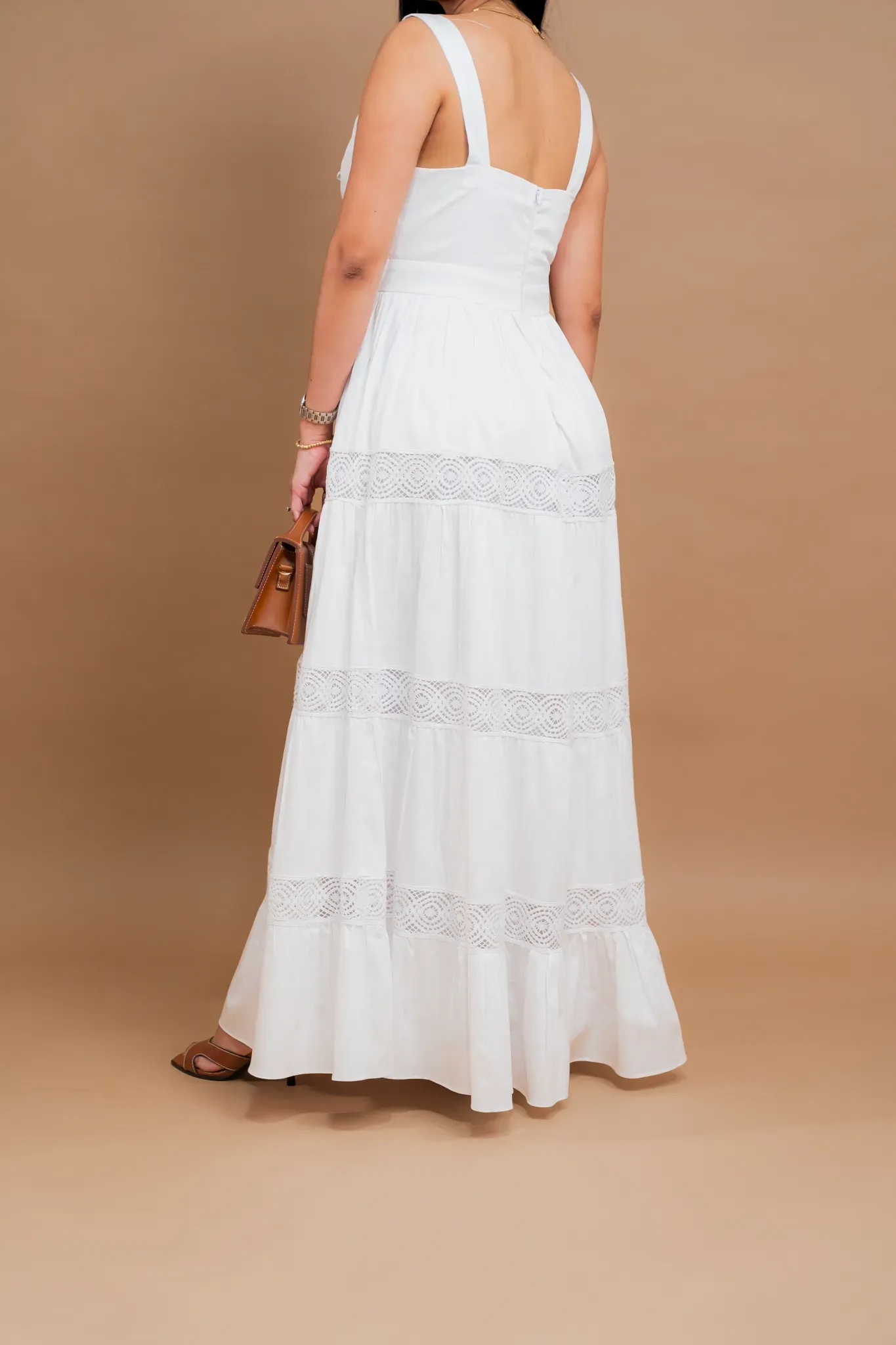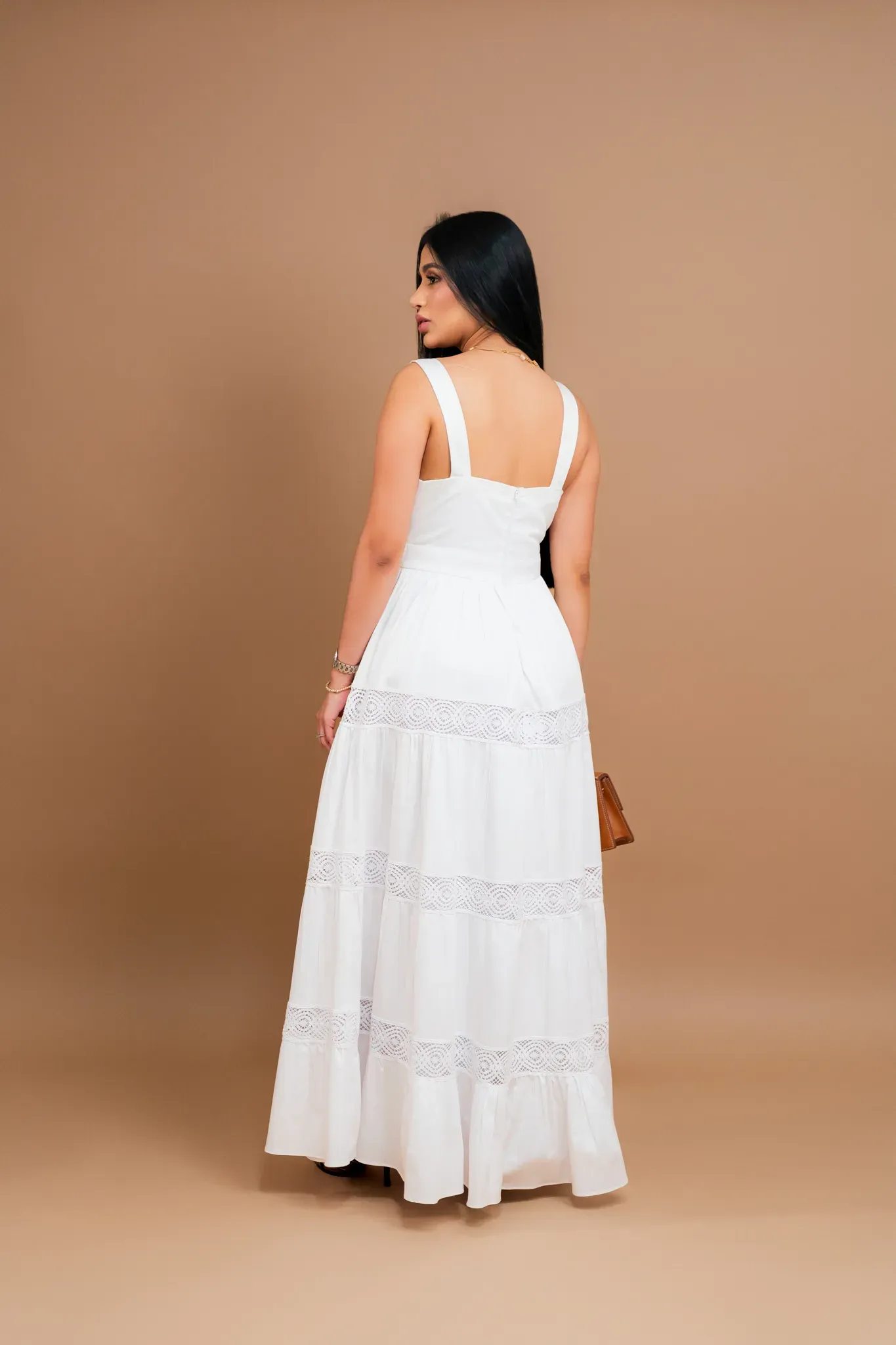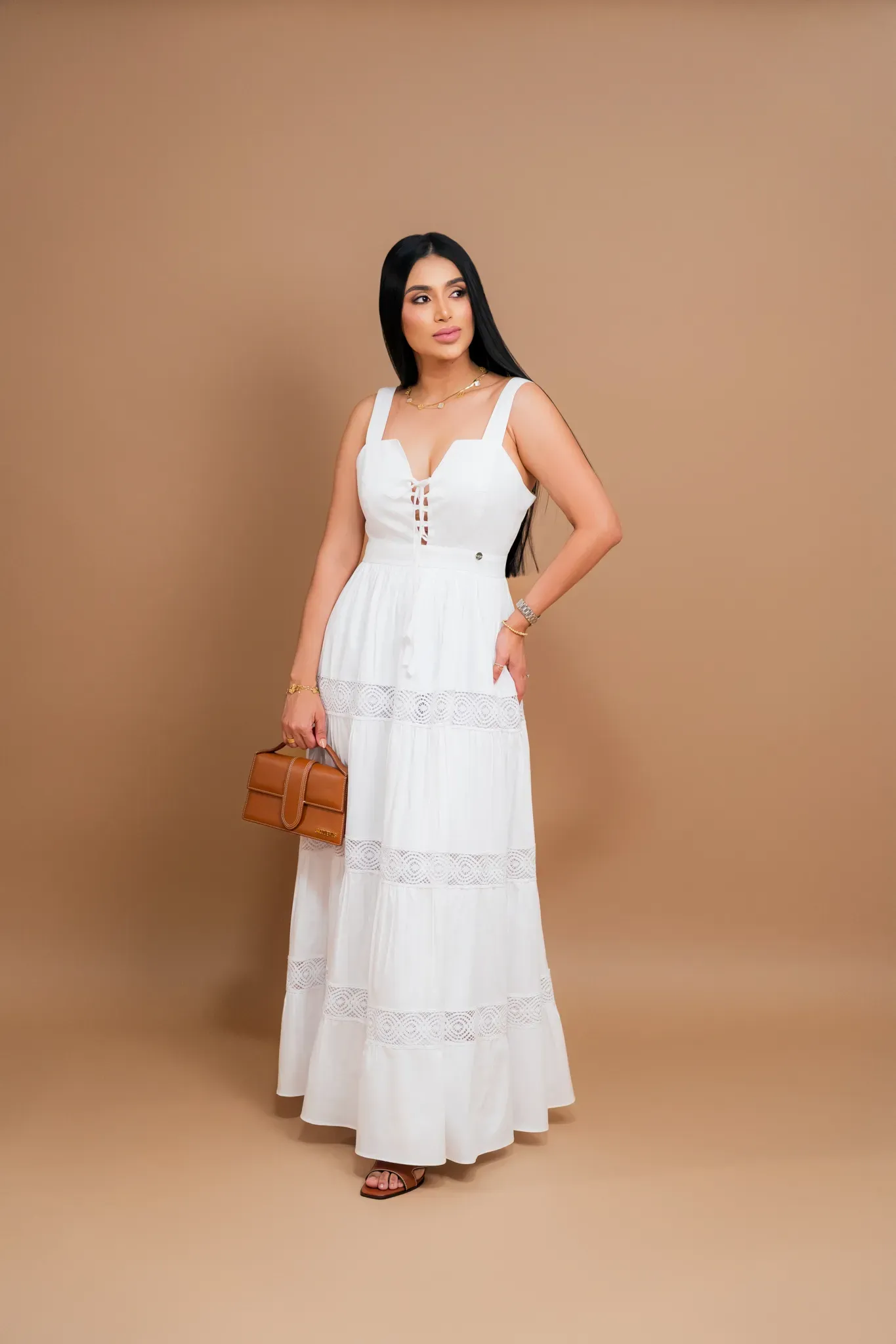 Vestido largo de algodón con detalles decorativos en encajes. Su diseño en canasta en la parte superior, escote en V y abertura ajustable lo hacen elegante y moderno. La falda adornada con encajes añade un toque femenino y sofisticado. ¡Ideal para lucir radiante en cualquier ocasión!